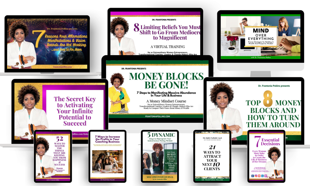 For more than 25 years, entrepreneurial leader, transformational coach, speaker, and trusted advisor, Dr. Frantonia Pollins has had one big mission: to empower 1,000,000 women worldwide to conquer their fears about money and wealth; inspire them to discover their own uniquely Divine and powerful purpose on the planet, and guide them as they create successful businesses that transform the world and leave a multi-generational legacy of wealth.